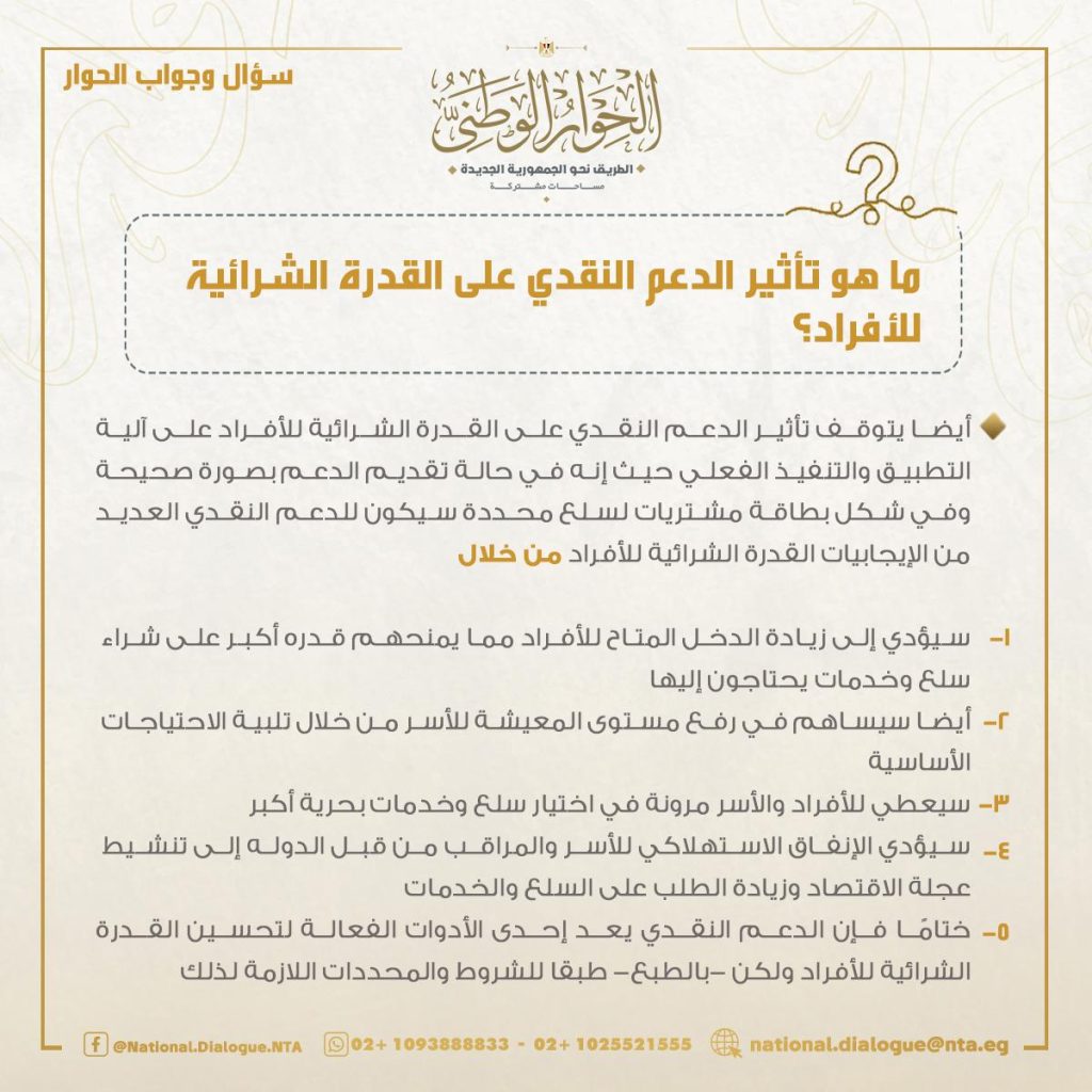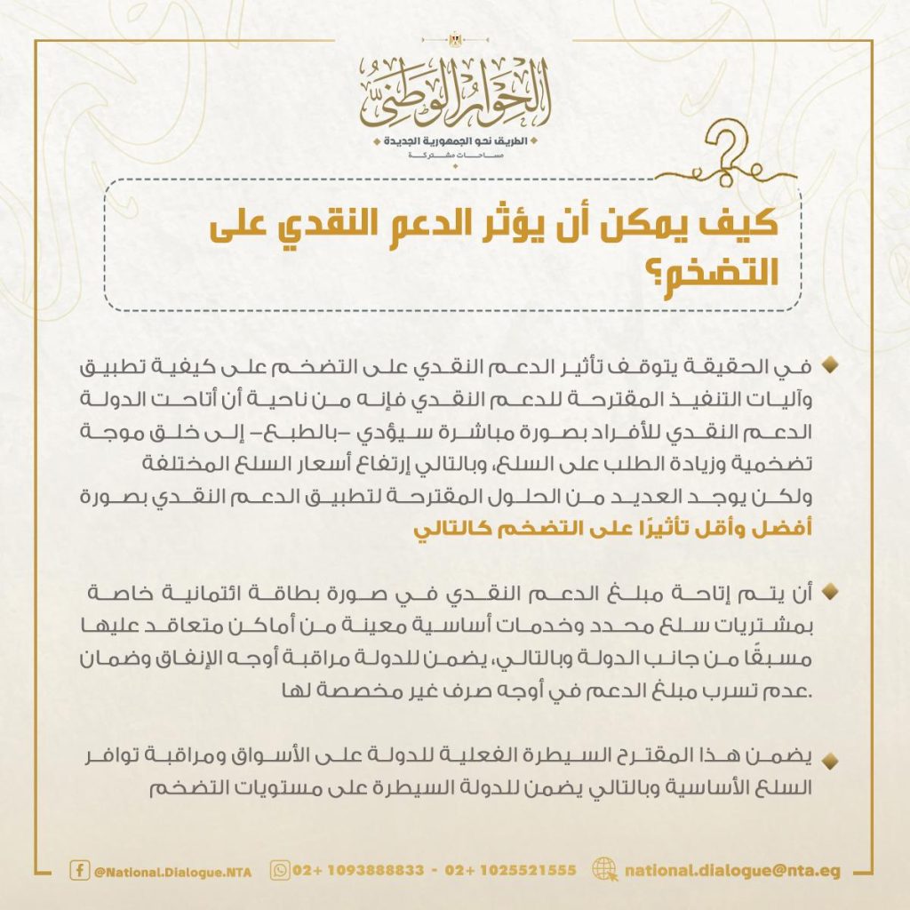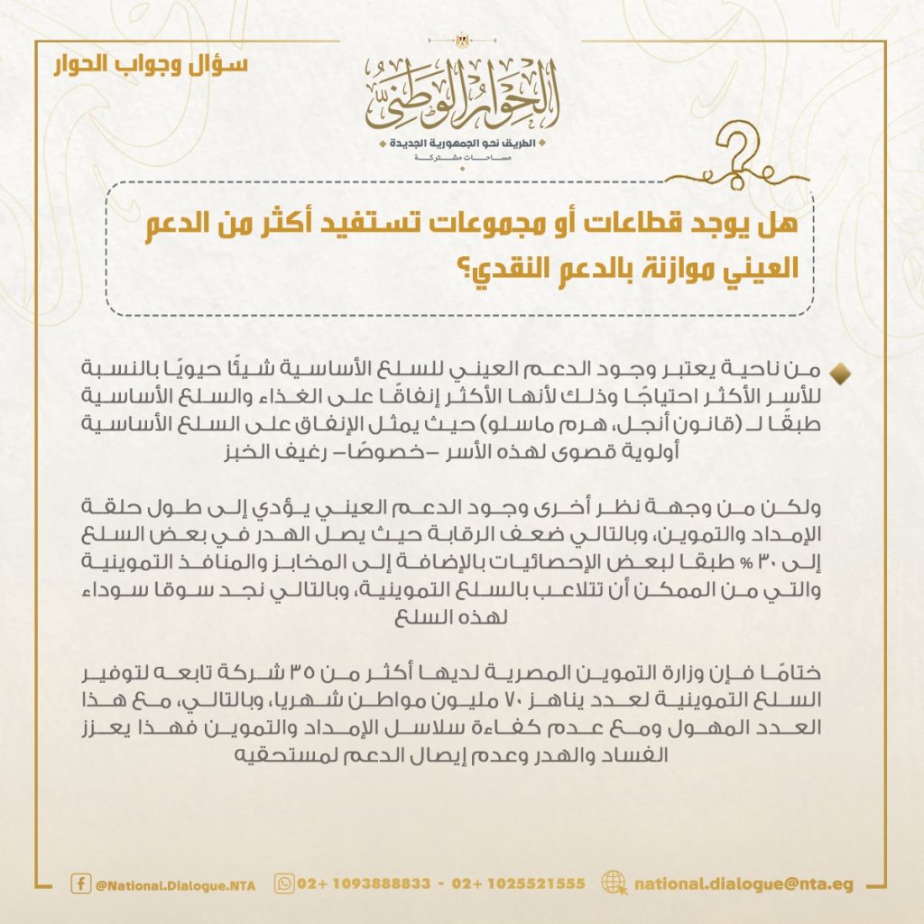 قال الحوار الوطني: “تعد مشكلة الدعم في مصر واحدة من أبرز التحديات الاقتصادية التي تواجه الحكومة منذ سنوات، إذ أنها من أهم أولويات القضايا كونها ترتبط بشكل وثيق باحتياجات المواطن وخصوصًا الفئات الأولى بالرعاية. واتصالًا مع هذا، وفي إطار حرص الحوار الوطني على تعزيز الوعي المجتمعي بكل تفاصيل قضية الدعم، يجيب الحوار الوطني على عدة تساؤلات تشغل الرأي العام وتلامس نبض الشارع المصري، وذلك عبر صفحته على موقع التواصل فيس بوك