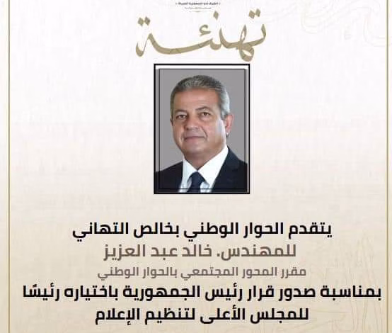 يتقدم الحوار الوطني بخالص التهاني للمهندس خالد عبد العزيز مقرر المحور المجتمعي بالحوار الوطني بمناسبة صدور قرار رئيس الجمهورية باختياره رئيسًا للمجلس الأعلى لتنظيم الإعلام
