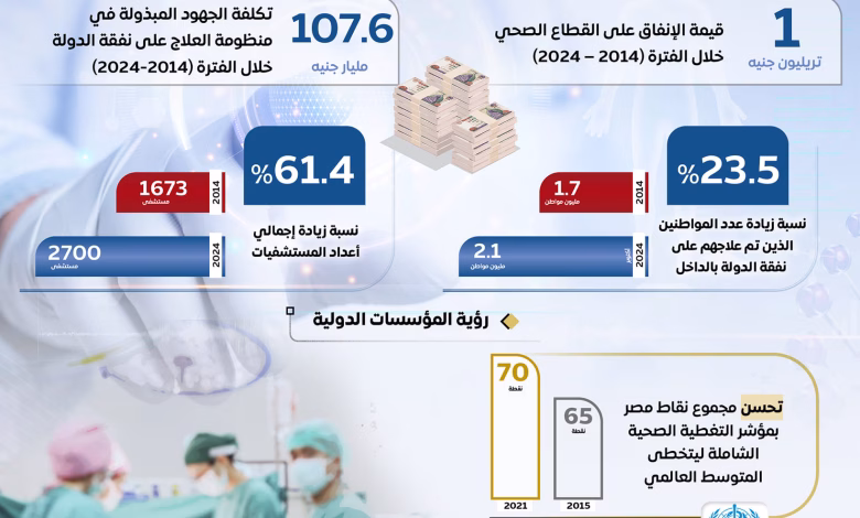يأتي هذا فيما بلغت نسبة زيادة عدد المواطنين الذين تم علاجهم على نفقة الدولة بالداخل 23.5%، حيث بلغ عددهم 2.1 مليون مواطن حتى أكتوبر من عام 2024، مقابل 1.7 مليون مواطن عام 2014، كما بلغت نسبة زيادة إجمالي أعداد المستشفيات 61.4%، حيث بلغ عددها 2700 مستشفى عام 2024 مقابل 1673 مستشفى عام 2014.